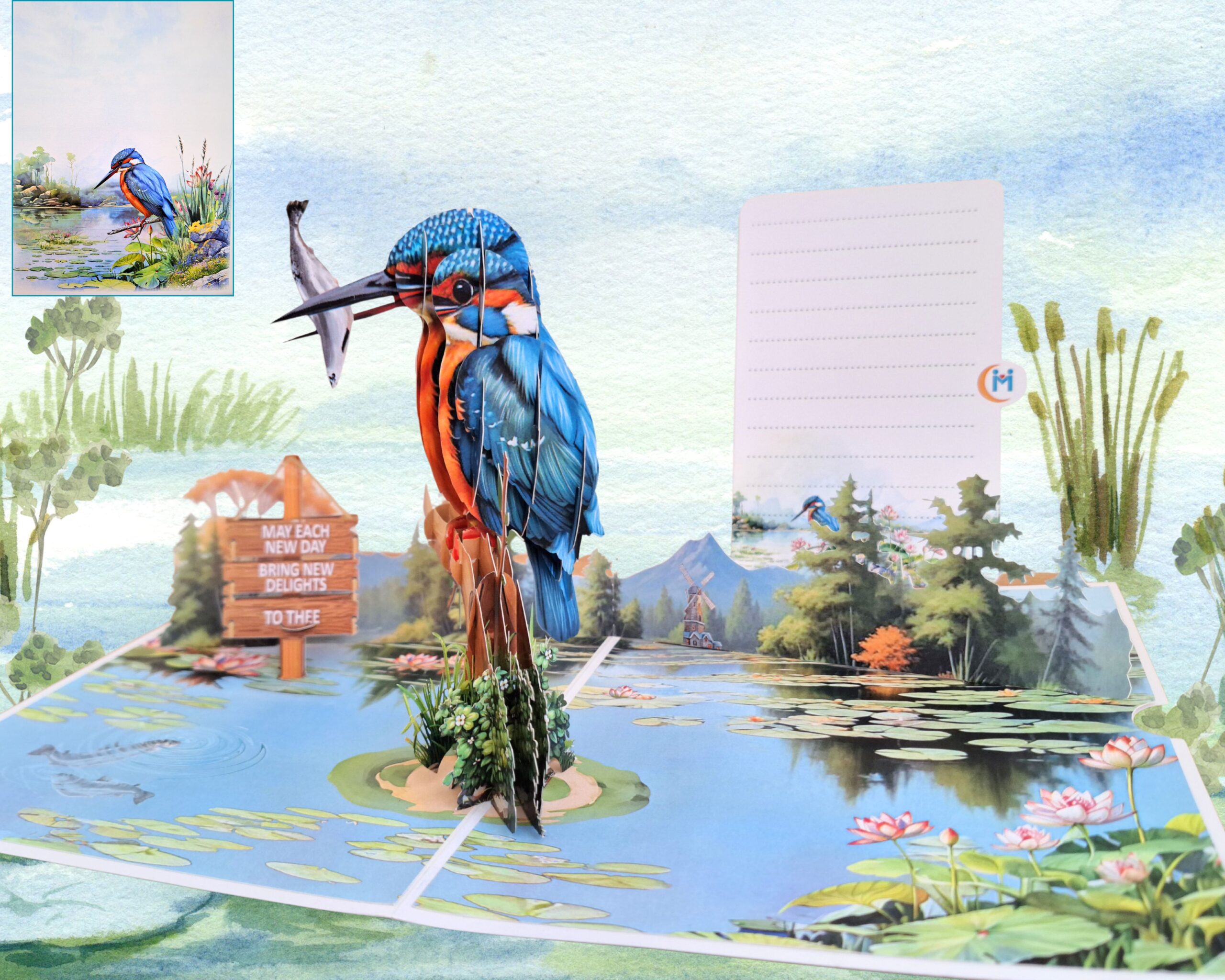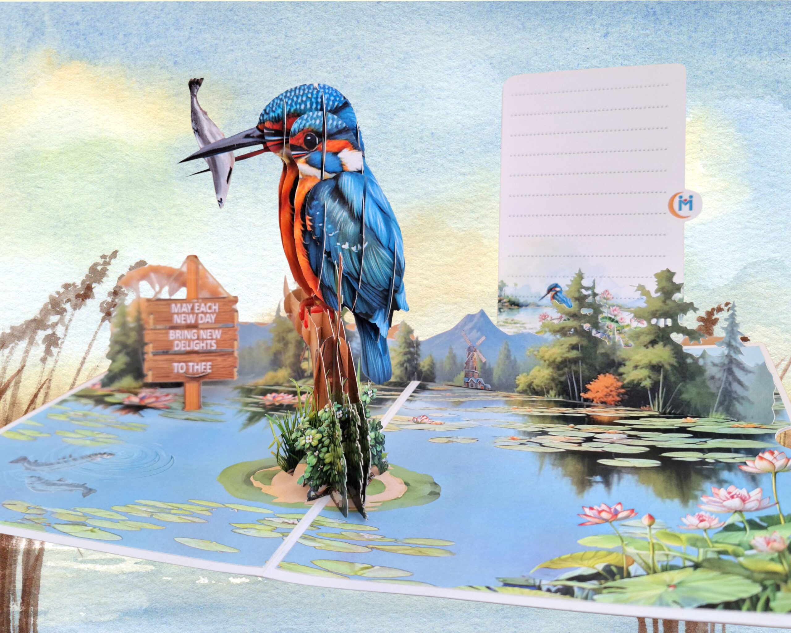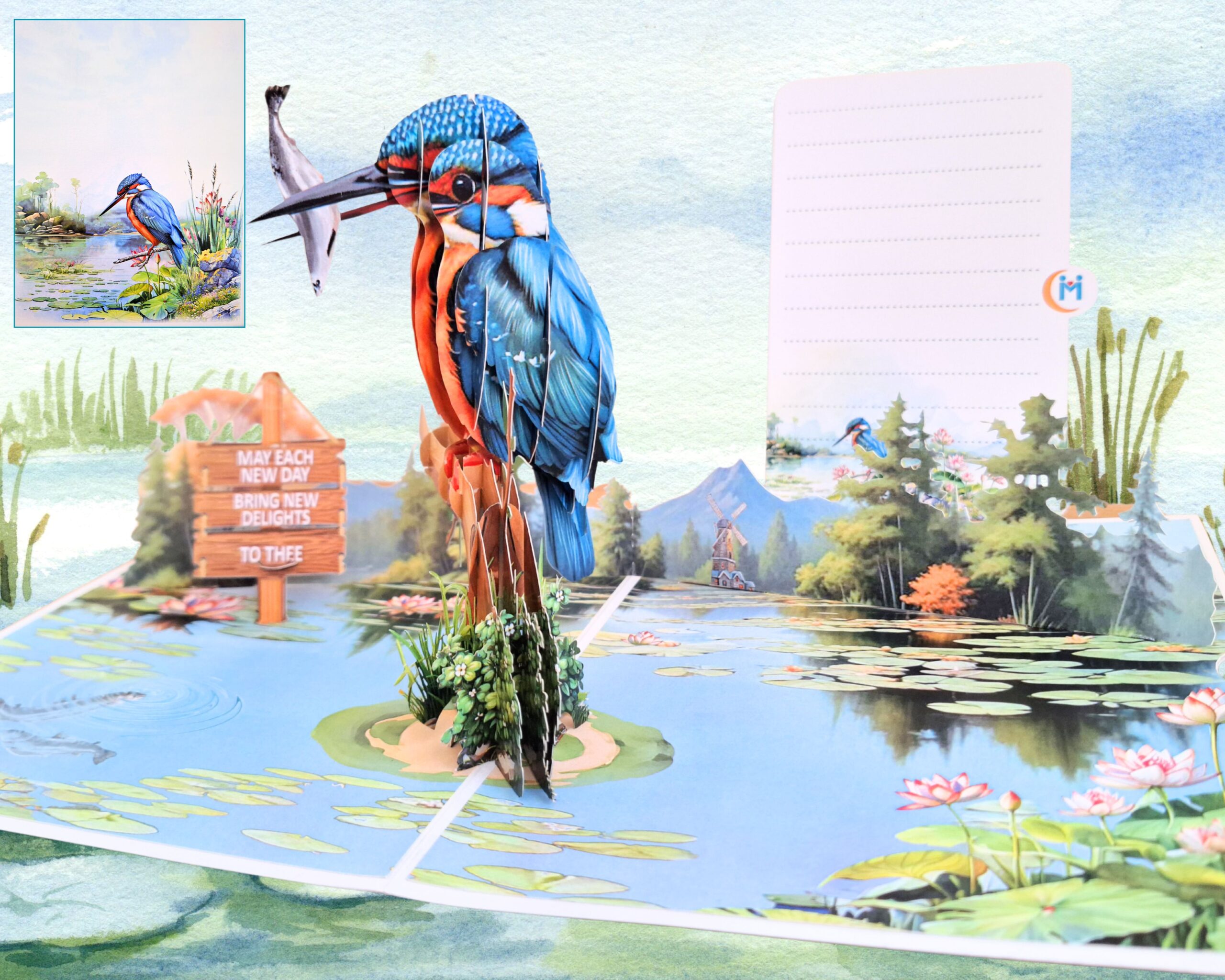 ✨ Why Choose This Card? Stunning 3D Design: Watch their eyes light up as the card unfolds to reveal a beautiful scene featuring a Kingfisher catching a fish in a serene scene of flowers, watermill and trees. It’s a delightful surprise that adds a touch of magic to any occasion, celebrating love, enchanting nature!